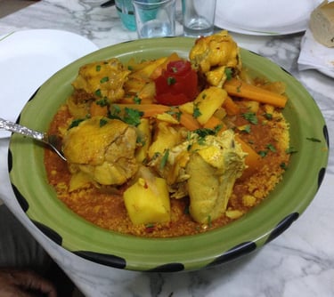 Decidiamo di andare a cena per il classico couscous. Atmosfera tipica, locale carinissimo, profumi da svenire. Arriva il piatto: sembra innocente, bello, colorato, invitante.